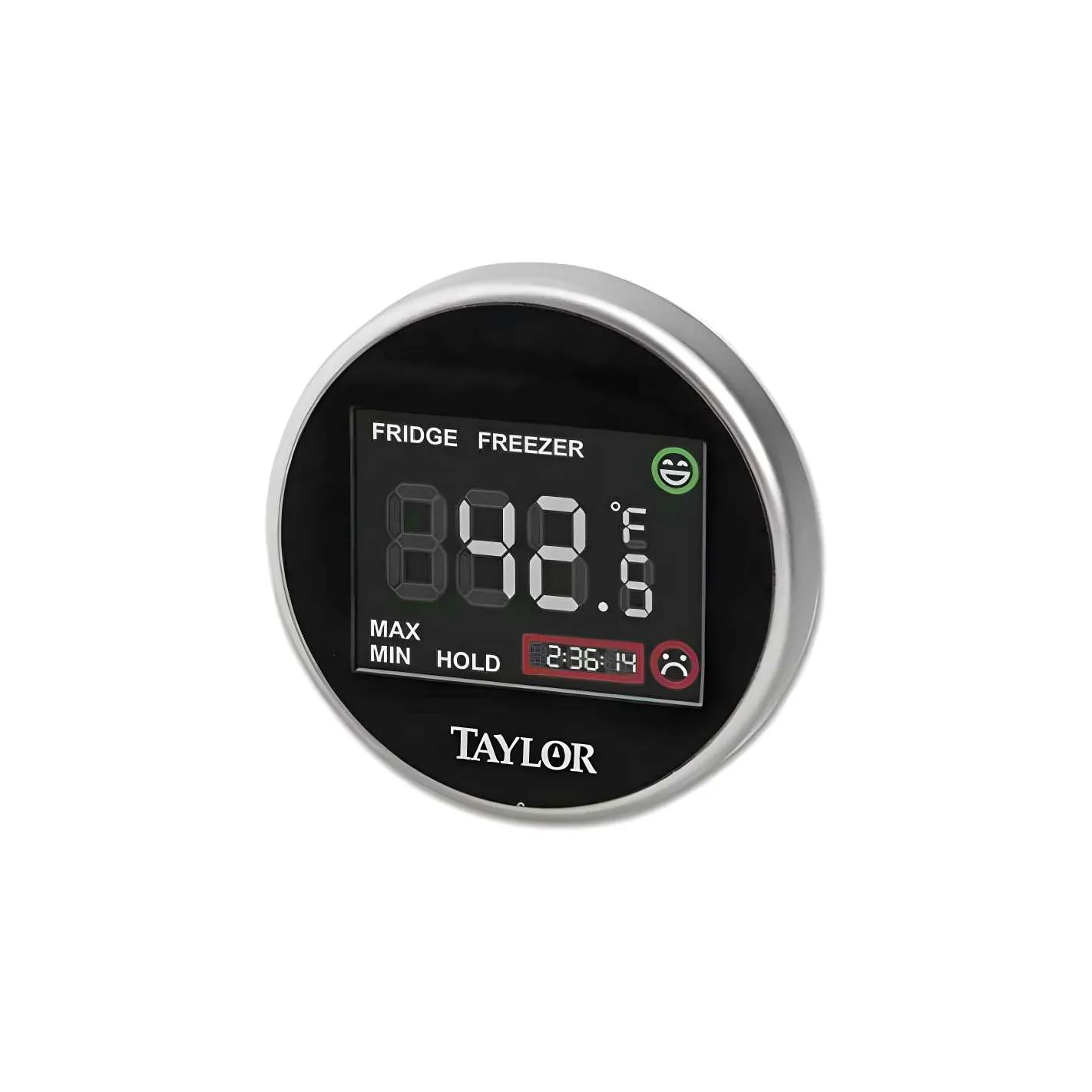 El termómetro digital Taylor para refrigerador y congelador garantiza que la temperatura en tu aparato sea lo suficientemente fresca como para mantener los alimentos frescos y seguros para comer. Este termómetro redondo se puede colocar en el refrigerador o congelador con el imán, clip o soporte adjunto. Está programado con una temperatura específica de zona "segura" que durante los cortes de energía registrará y mostrará la cantidad de tiempo que la temperatura estaba por encima de la óptima para que puedas controlar posibles preocupaciones de seguridad alimentaria.