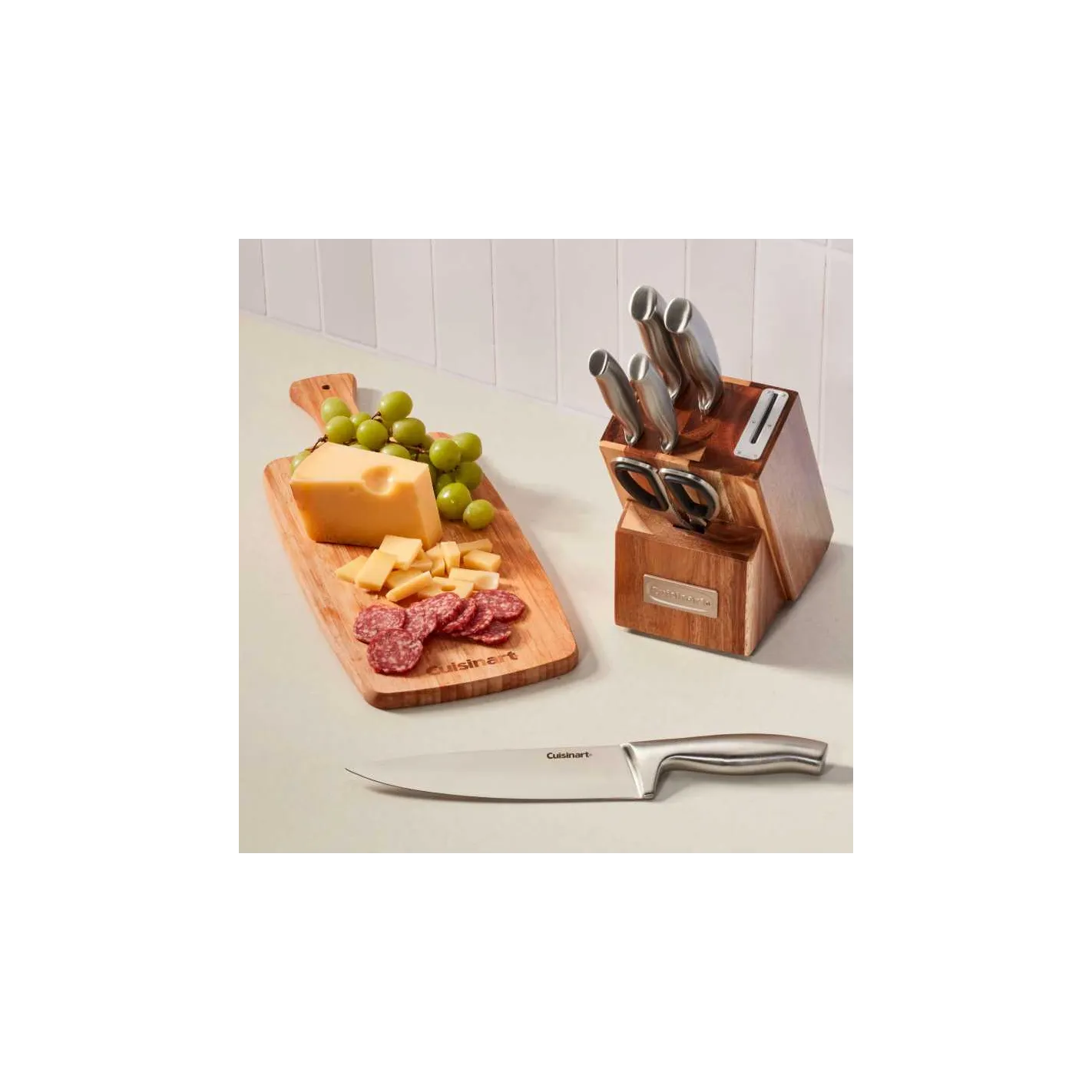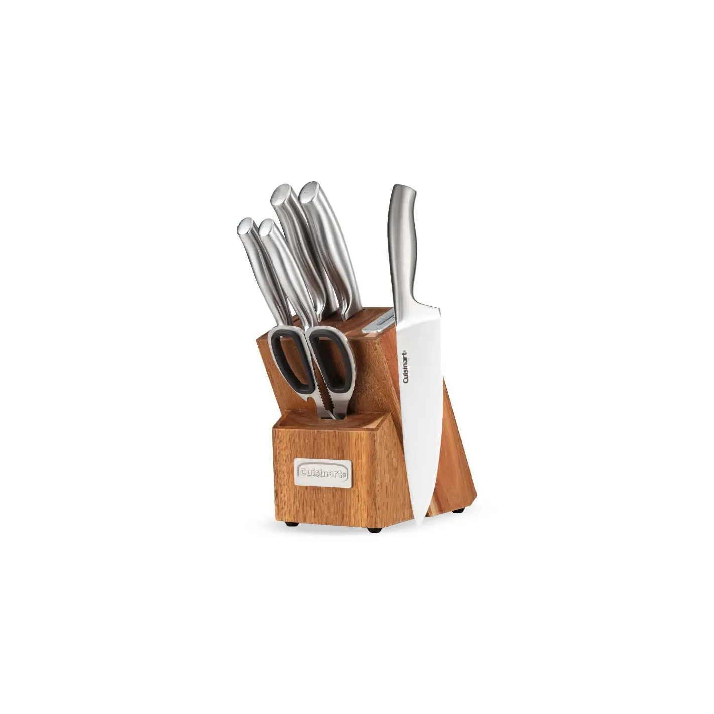 Los cuchillos de acero inoxidable realizan cada trabajo sin esfuerzo con fuerza, estabilidad y equilibrio que le brindan un control total. con un afilador incorporado en el bloque, las hojas mantienen un filo de precisión para un corte consistente en cada uso. incluye: cuchillo de chef de 8" cuchillo para rebanar de 8" cuchillo santoku de 7" cuchillo multiusos dentado de 5.5" cuchillo pelador de 3.5" tijeras de acero inoxidable, bloque de madera de acacia con afilador incorporado.