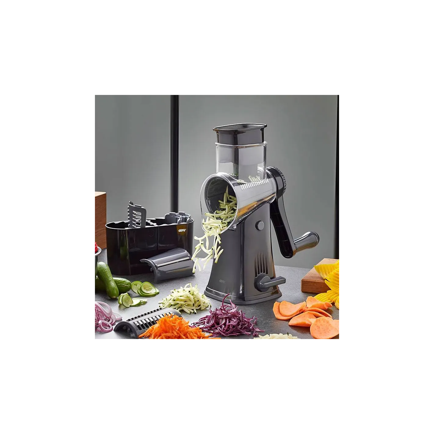 El Rallador de Tambor GEFU CLICK es la herramienta ideal para quienes buscan eficiencia y versatilidad en la cocina. Diseñado para rallar y cortar una variedad de alimentos como vegetales, frutas, quesos, chocolates y nueces, este rallador manual cuenta con cinco cuchillas intercambiables que permiten realizar cortes en lonchas, lonchas onduladas, raspa gruesa, juliana fina y juliana gruesa. Su manivela giratoria facilita el proceso, mientras que su base con ventosa asegura estabilidad durante el uso. Además, incluye una caja de almacenamiento para las cuchillas, manteniéndolas organizadas y seguras. La carcasa es desmontable y, junto con las piezas (excepto la base y la caja de almacenamiento), apta para lavavajillas, lo que simplifica la limpieza. El GEFU CLICK combina funcionalidad, durabilidad y diseño alemán de alta calidad.